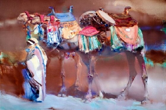 Мастерски орудуя этими инструментами, художник будто волшебник постепенно на полотне вырисовывает узнаваемые образы, к примеру бедуинов с верблюдами или мчащегося куда-то вдаль воина-всадника, кочевников или же загадочных восточных женщин.