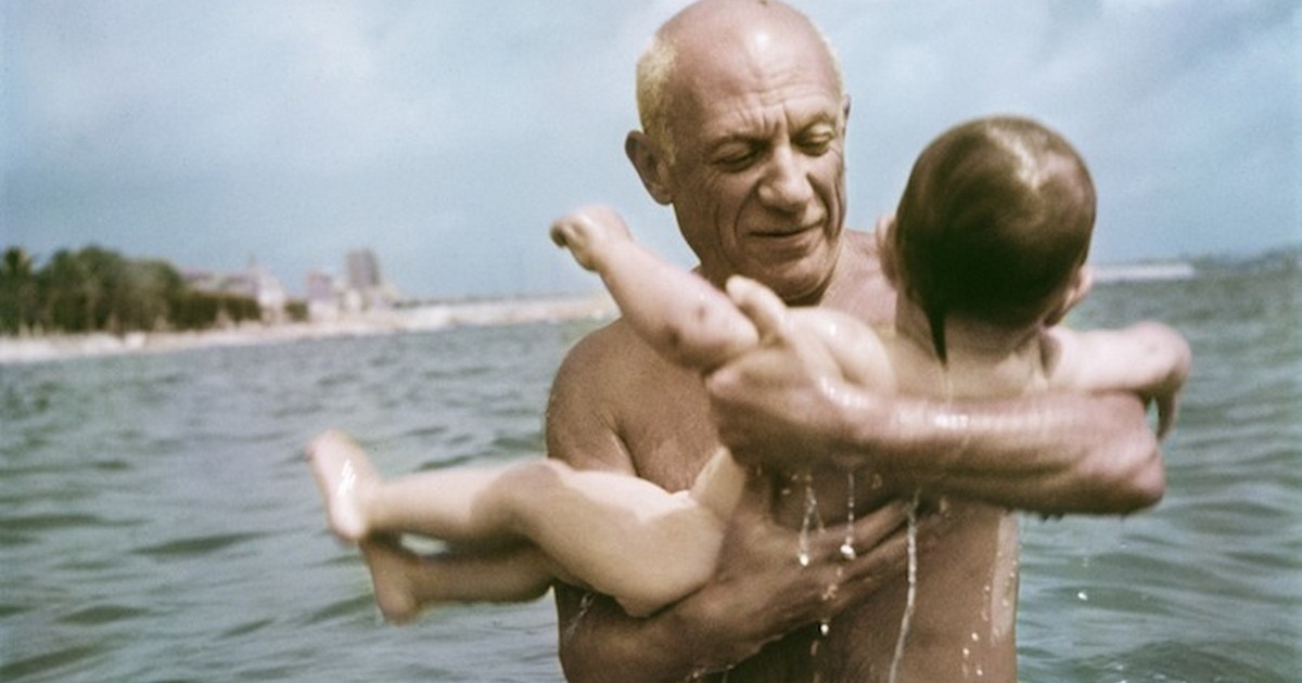 Пабло Пикассо играет в воде с сыном Клодом, Франция, 1948