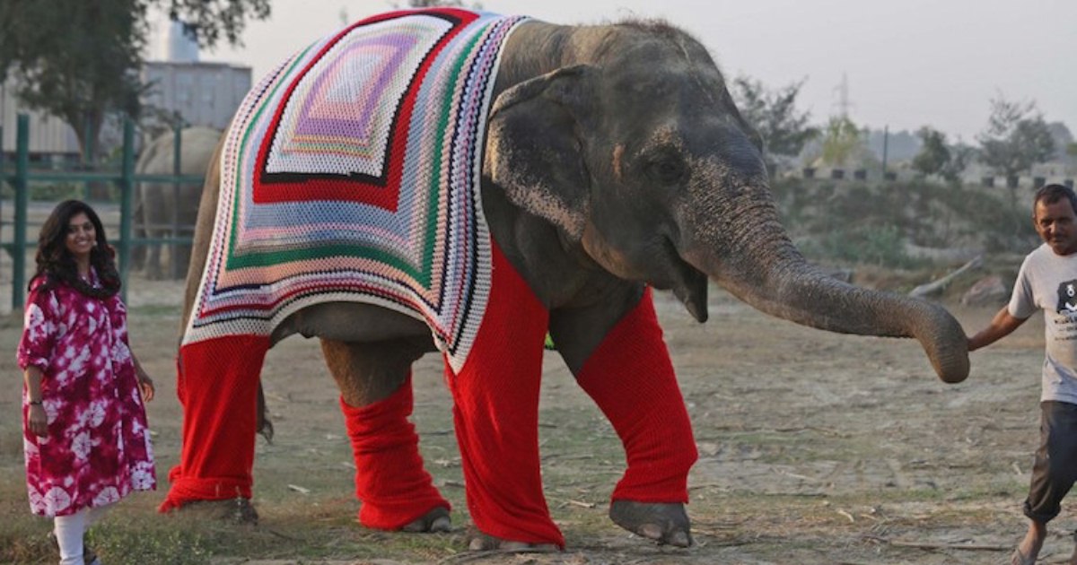 Эта душевная история произошла в индийском городе Матура, в центре Wildlife SOS Conservation and Care Center, где занимаются проблемами диких животных. Из-за резкого похолодания слонов срочно потребовалось утеплить: вначале животных укутывали в пледы, а потом решили вязать для них свитера. Вязанием занялась вся местная деревня: люди с удовольствием приобщились к необычному проекту, многие готовы дни напролет проводить со спицами в руках, чтобы помочь слонам.