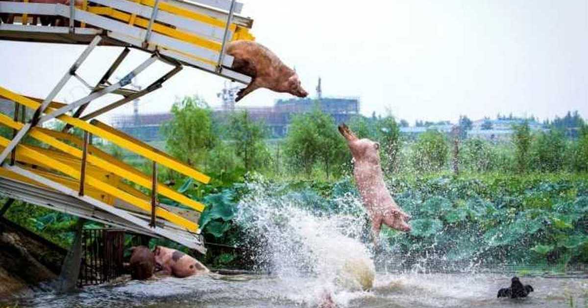 Обитатели китайской свинофермы увлекаются водными процедурами. Автор фотографии: Хуанг Деминг.