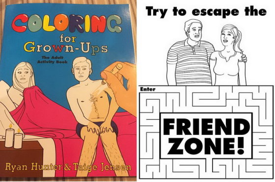Раскраски для взрослых становятся все популярнее с каждым днем. Художники Райан Хантер и Тайдже Дженсен недавно презентовали издание, напоминающее традиционные развивающие книжки. Правда, содержание его совсем не детское. Секс, депрессивные расстройства и несбывшиеся юношеские мечты – все эти темы «приправлены» едкой иронией и черным юмором.