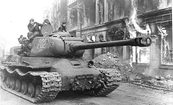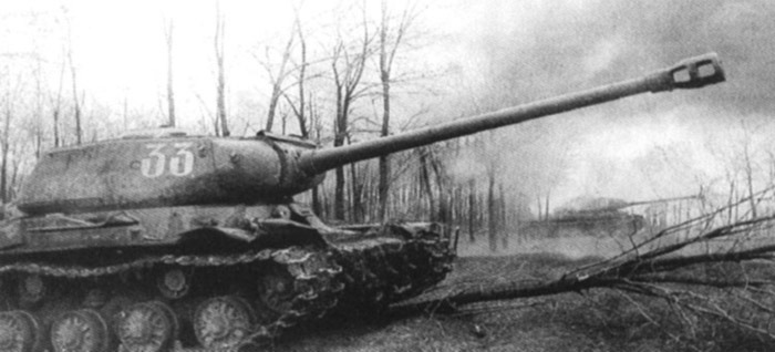 Тяжёлые танки ИС-2 30-го гвардейского танкового полка из 2-го гвардейского механизированного корпуса ведут наступление на Будапешт. 2-й Украинский фронт, декабрь 1944 года. / Фото: bronetehnika.narod.ru