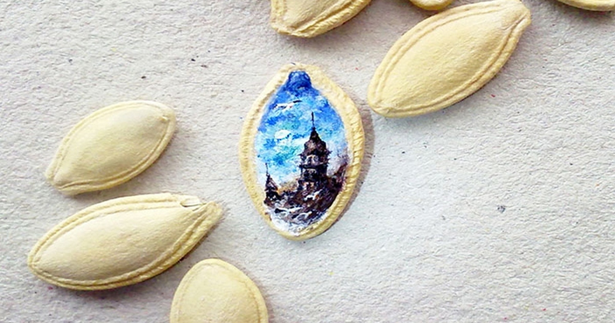 Mesut Kul – турецкая художница, которая рисует миниатюрные картины на крошечных предметах. Даже на тыквенном зернышке девушка умудряется изобразить целый пейзаж – не забыв про композицию, подбор цветов и прорисовку деталей.