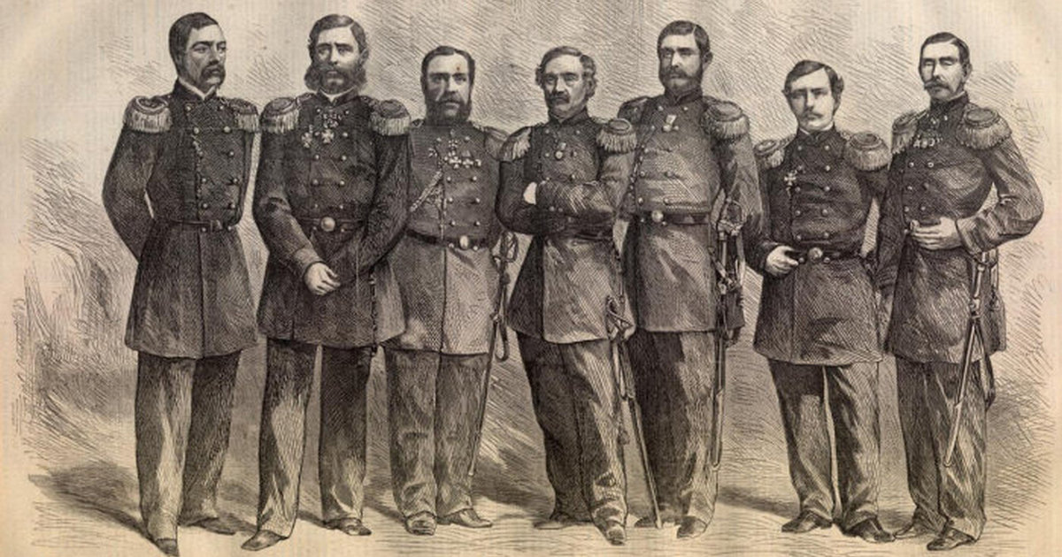 Капитаны экспедиции. Слева направо: П. А. Зеленой (клипер «Алмаз»), И. И. Бутаков (фрегат «Ослябя»), М. Я. Федоровский (фрегат «Александр Невский»), адмирал С. С. Лесовский (командир эскадры), Н. В. Копытов (фрегат «Пересвет»), О. К. Кремер, (корвет «Витязь»), Р. А. Лунд (корвет «Варяг»)./Фото: img-fotki.yandex.ru