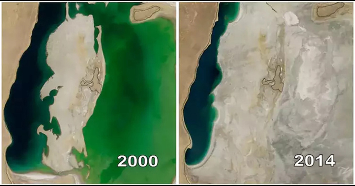 Озеро было таким большим, что его называли морем. В 1960 годах власти СССР решили брать воду из двух рек, Амударья и Сырдарья, которые впадали в озеро, для орошения полей с урожаем. Это существенно снизило уровень воды в Аральском море, и уже в 2000 году озеро распалось на две части. Всего 14 лет спустя от озера почти ничего не осталось. Вследствие изменений озера, местный климат также сменился: теперь здесь холоднее зимой и значительно жарче и суше летом.