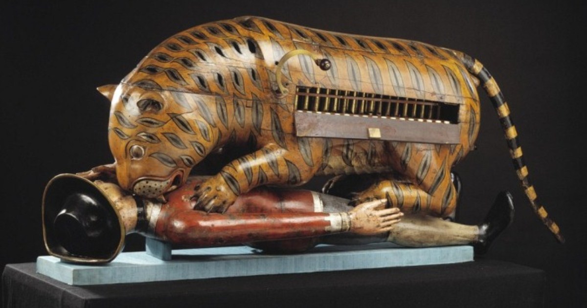 Деревянную игрушку обнаружили 4 мая 1799 года, когда британцам наконец удалось захватить княжество Майсур. Английские солдаты грабили сокровища султана Типу, и вдруг в музыкальной комнате его дворца обнаружили эту игрушку. И тигр, и солдат выполнены в натуральную величину, животное с остервенением вгрызается в шею несчастного, издавая при этом угрожающий рев. Специальный механизм приводит в движение руку солдата, кажется, что он отчаянно сопротивляется. Сбоку механической игрушки – примитивный орган на 18 нот.