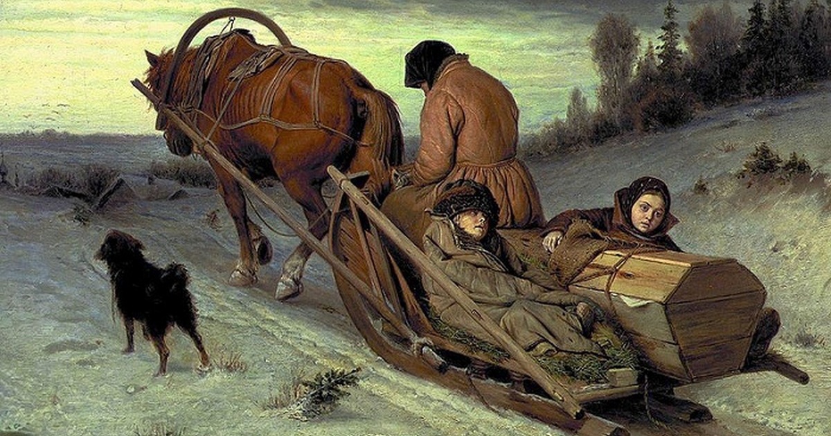 Перов создал в 1865 году одну из лучших своих картин: «Проводы покойника». Полотно хоть и было небольшим по размерам, но великим по содержанию… Художник мастерски показал безысходность и одиночество крестьянской семьи, оставшейся без кормильца.