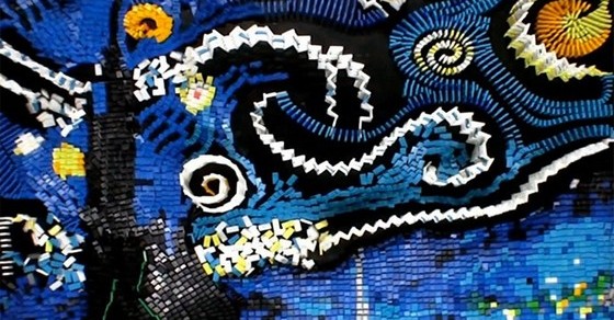 В последние годы популярное во всем мире развлечение по созданию фигур из костяшек домино и последующее их разрушение превратилось в самое настоящее искусство. Среди лучших мастеров, занимающихся им, можно назвать FlippyCat. Он освоил «эффект домино» на твердую пятерку с плюсом. А очередной работой этого автора, созданной из костяшек, стала копия картины Ваг Гога «Звездная Ночь».
