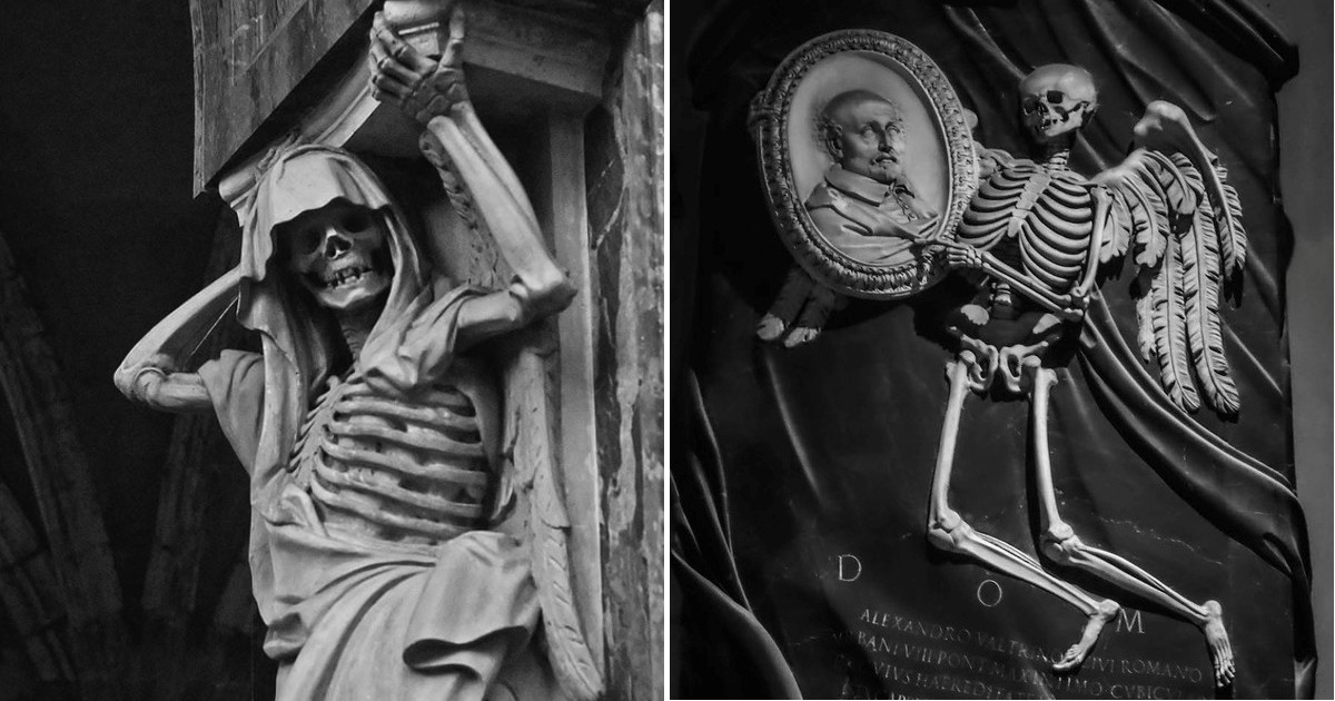 Повсюду в церквях Рима можно встретить лики смерти. Они украшают могилы знатных людей и католических священников. Эти мраморные мемориальные украшения -удивительные скульптурные произведения искусства, которые философски символизируют смертность бытия.
