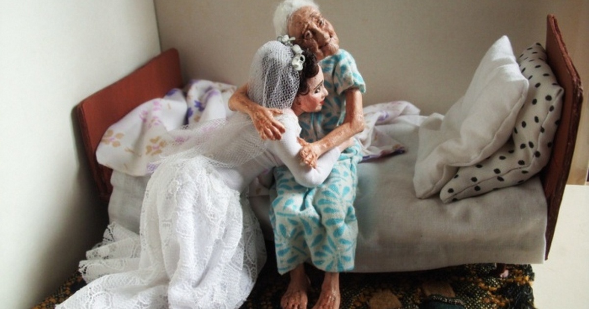 Другая работа Ирины – это целая сценка: внучка в свадебном платье и фате обнимает свою сидящую на кровати бабушку, и неясно, кто более счастлив – то ли невеста, то ли старушка, на лице которой написано: «Как хорошо, что дожила…» Что будет дальше – после того, как бабушка благословит свою внучку и отправит в «свободное плавание»? Старушка навсегда останется в одиночестве или молодые будут ее навещать? Тут можно пофантазировать…