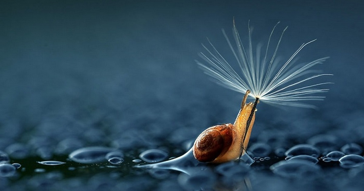 Семя одуванчика отлично подошло в виде зонтика для маленькой улиточки.