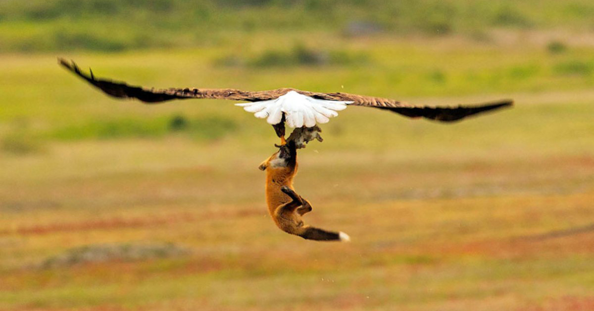 Наглый орёл всё ещё пытается отобрать добычу у лисы, поднимая рыжую в воздух. Автор: Kevin Ebi.