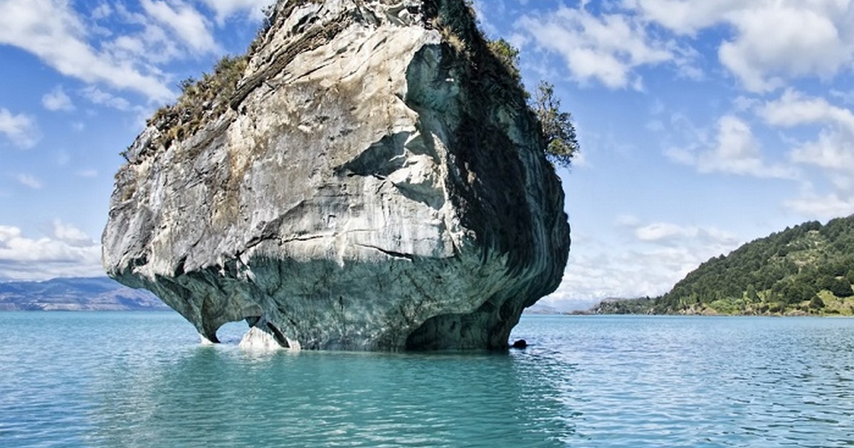 Яркие синие пещеры, частично погруженные в бирюзовые воды озера Каррера.