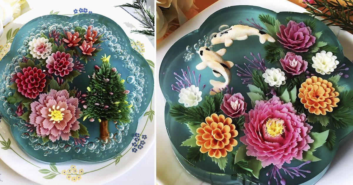Желейные 3D-торты имеют все шансы на то, чтобы стать новым кулинарным трендом. Мастерица Сью Хен Бун из обычных, казалось бы, ингредиентов, создает фантастические композиции, украшенные цветами и золотыми рыбками.