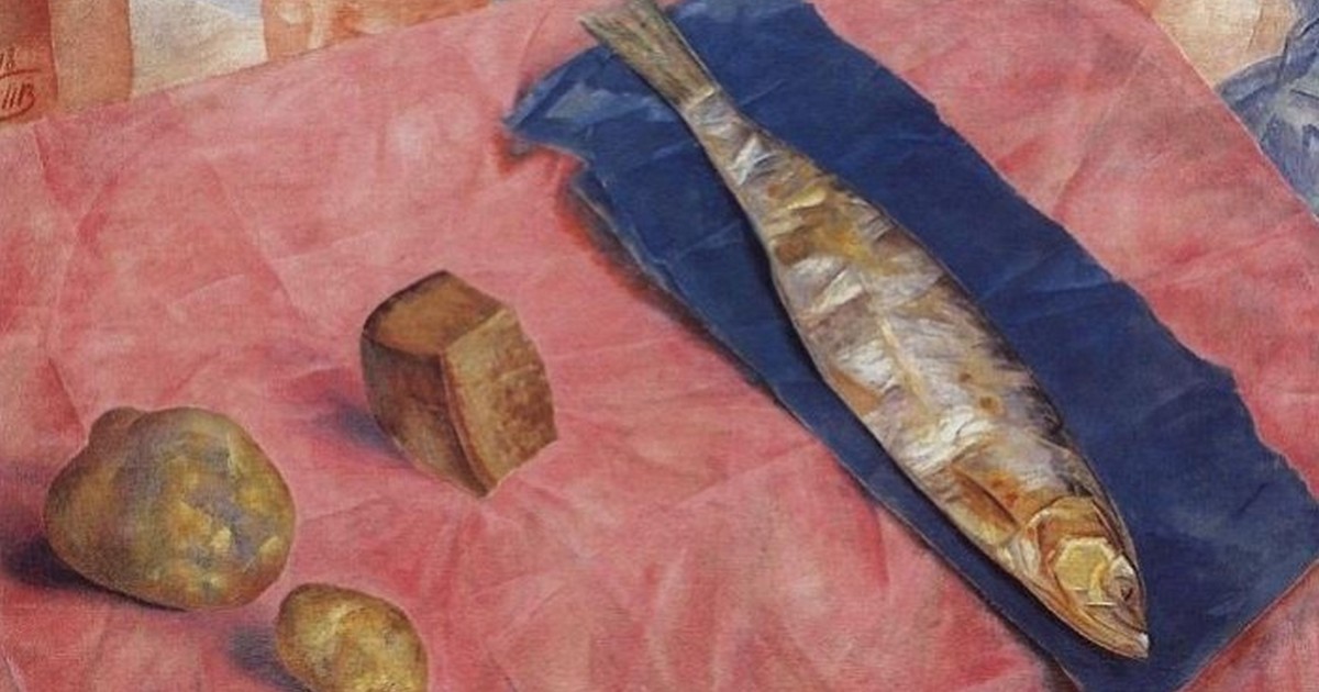 Не обязательно знать историю или владеть особым художественным взглядом, чтобы понять какой символизм несет натюрморт «Селедка» Кузьмы Петрова-Водкина. Это практически художественная летопись эпохи. Две картофелины, селедка, кусок хлеба. Бесхитростный набор для обеда, на красной скатерти, символизирующей революцию – все собрано наспех, даже картошки несуразно разных размеров и странных форм, а селедка завернута в пергамент. Хлеб нарезан как для пайка, как бы демонстрируя, ограниченность, присутствие нормативов во всем.