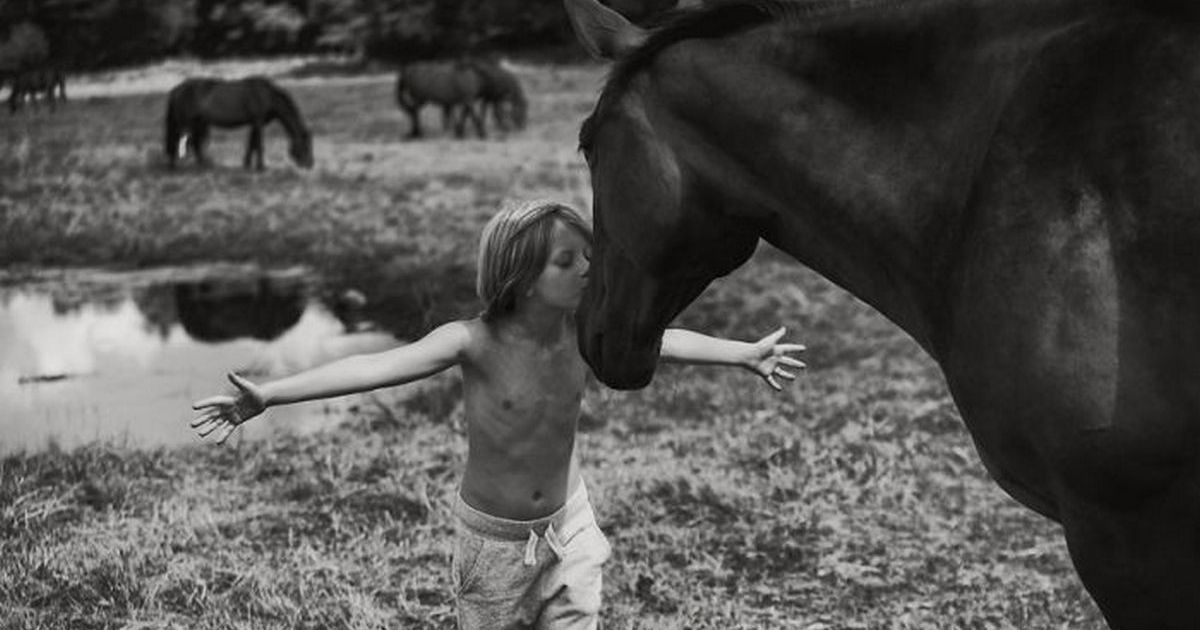Черно-белое фото передает всю радость момента из жизни мальчика и животных.