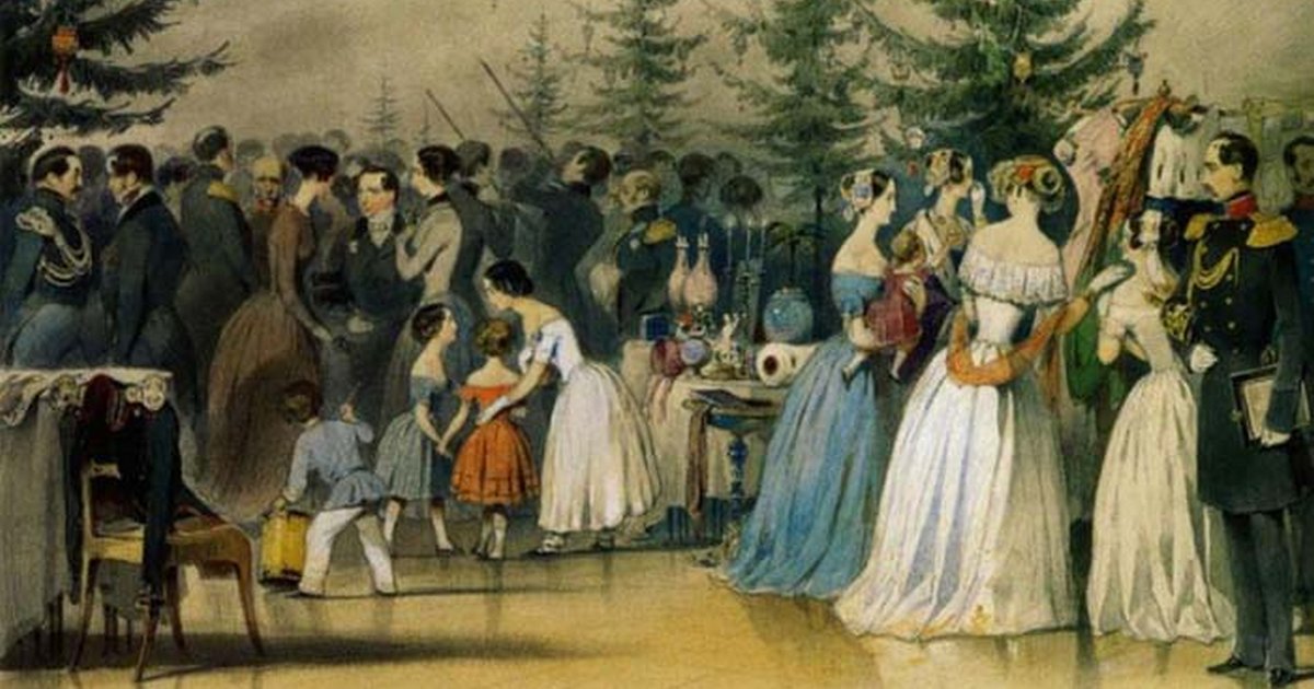 В России же большой любительницей новогодних забав была Екатерина II. Семен Порошин, один из воспитателей великого князя Павла, описывал в воспоминаниях, что игры происходили в аудиенц-комнате, которую называли Тронной залой. Именно здесь устраивались развлечения для придворных, в которых «Ее Величество во всех играх сама быть и плясать изволила». Любимой игрой того времени были русские бирюльки (деревянные или костяные палочки, которые надо было растаскивать из кучи, не задев другие). Еще одна веселая потеха называлась «рукобивка»: «когда с длинной лентой вставали в круг и некоторые ходили по кругу и прочих по рукам били…». А первая настоящая праздничная елка в России была установлена только в 1817 году. Ее устроила великая княгиня Александра Федоровна, жена будущего императора Николая I. В Германии такая традиция существовала уже очень давно, и с легкой руки дочери Фридриха Вильгельма III прижилась и у нас. Сначала домашняя елка была устроена в Аничковом дворце, где молодая семья жила до декабря 1826 года, а затем и в Зимнем.