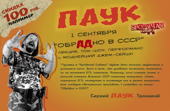 Российский музыкант, лидер рок-группы «Коррозия металла» Сергей «Паук» Троицкий представляет свою новую и уже далеко не первую книгу. Новая книга рок-музыканта посвящена распаду СССР и 21-летию ГКЧП и получила название «ОбрАДно в СССР». Презентация книги состоится в сентябре.