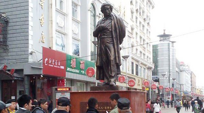 В городе Хэйхэ в Китае открылся необычный книжный магазин-кафе. В честь этого события был установлен памятник классику русской литературы – Александру Сергеевичу Пушкину. Интересно то, что в ходе установки произошел забавный конфуз с мемориальной надписью. Подробнее