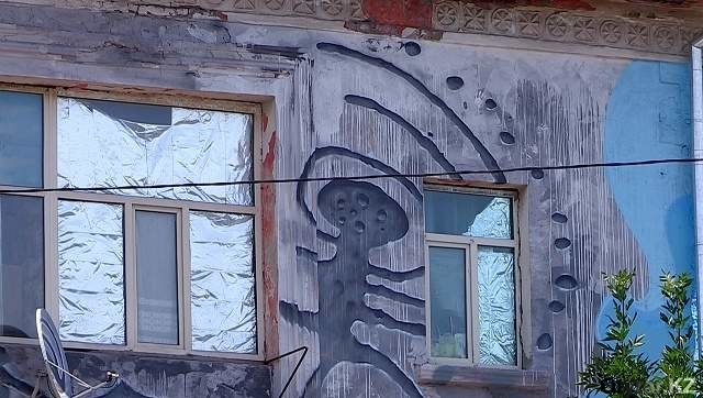 Команда молодых художников решила творчески подработать над зданиями Шамкента. В результате их труда на стене многоэтажного дома появились наскальные петроглифы. Подробнее