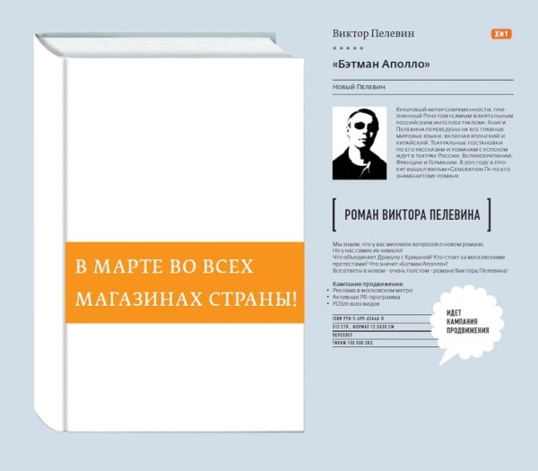 Новый роман Пелевина «Бэтман Аполло» начал продаваться 28 марта в полночь в букинистических ТЦ «Москва» на Воздвиженке и на Тверской. Об этом сообщает РИА «Новости» со ссылкой на издательство «Эксмо».