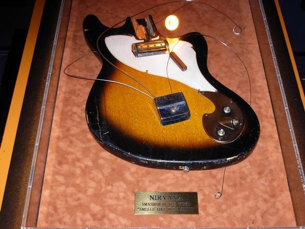 На интернет-аукционе появилась легендарная гитара Курта Кобейна, которую он разбил во время съемок клипа «Smells Like Teen Spirit». Стартовая цена лота на данном аукционе составляет 150 тысяч долларов. Подробнее