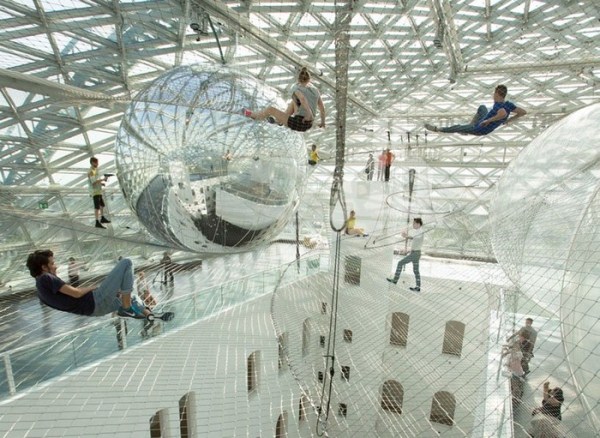 22 июня в Дюссельдорфе в художественном музее «K21 Штендехаус» открылась необычная инсталляция аргентинского художника Томаса Сарацено «На орбите». На высоте 20 метров под куполом здания натянуты три уровня сетки, по которой посетителям разрешается лазить.