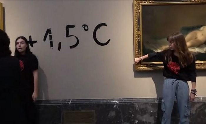 В субботу двое активистов движения за климат приклеили руки к рамам двух картин испанского мастера Франсиско Гойи в музее Прадо в Мадриде. Полиция заявила, что протестующие не повредили полотна «Маха обнажённая» или «Маха одетая», но они нацарапали на стене «+1,5°C» Подробнее