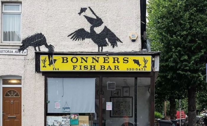 Уличный художник-аноним Бэнкси представил в пятницу (9 августа) еще одну работу на тему животных — уже пятую на этой неделе. Он подтвердил в Instagram, что именно он - автор новой работой с изображением двух пеликанов над закусочной, торгующей рыбой и чипсами, на северо-востоке Лондона, как и в случае с предыдущими работами. Подробнее