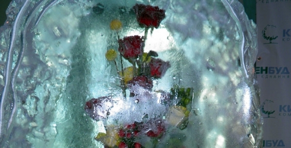 На Певческом поле в столице Украины городе Киеве открыта «Выставка цветов Снежной Королевы». Экспонаты этой выставки являют собой художественные цветочные композиции в замороженных ледовых фигурах.
