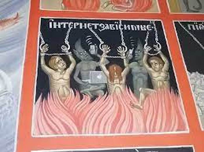 На одной из стен храма мужского Малицкого монастыря, находящегося в Тверской области, появились необычные фрески – черти со смартфонами и ноутбуками в лапах, а рядом с ним скованные цепями горят в огне грешники Подробнее