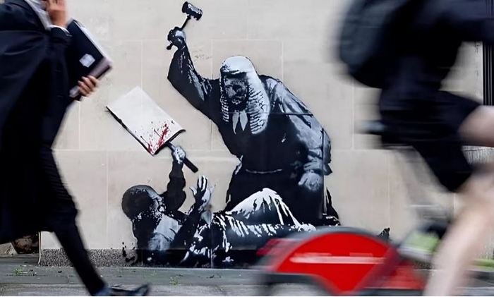 Новое граффити неуловимого бристольского художника Бэнкси было быстро скрыто после появления на стене здания Королевского суда Лондона. На картине изображён судья, бьющий молотком беспомощного протестующего. Подробнее