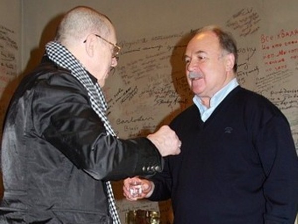 Валерий Золотухин, руководитель Театра на Таганке, и Николай Губенко, возглавляющий театр «Содружество актеров Таганки», встретились и, наконец, обменялись рукопожатьями.